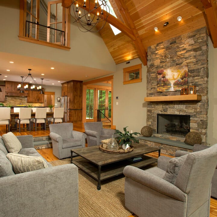 The airy gray tufted sofa faces the rustic stone fireplace. Furthermore, matching armchairs give this open-layout living room elegance.