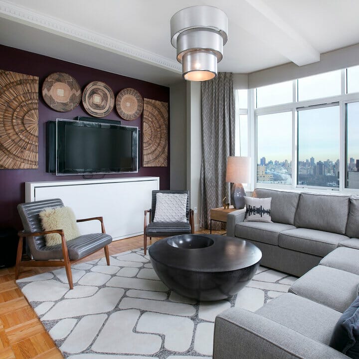 The warm gray sectional sofa and walls keep the room welcoming. Furthermore, grasscloth and shaggy rugs improve the area’s cozy factor.