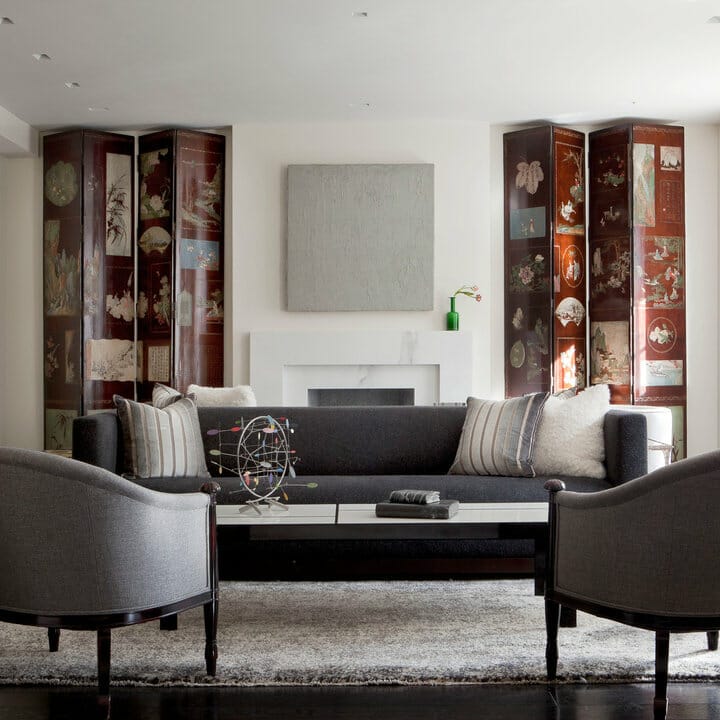The deep gray couch emphasizes comfy white and striped accent pillows. Upholstered armchairs fit in with it perfectly, while the freestanding colorful embellishment steals attention.