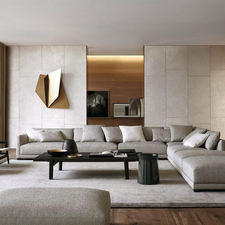 Some gray couch living room ideas are ideal for spacious abodes. Airy gray tones dominate the space via the U-shaped sectional, ottoman table, and subtle patterned rug.