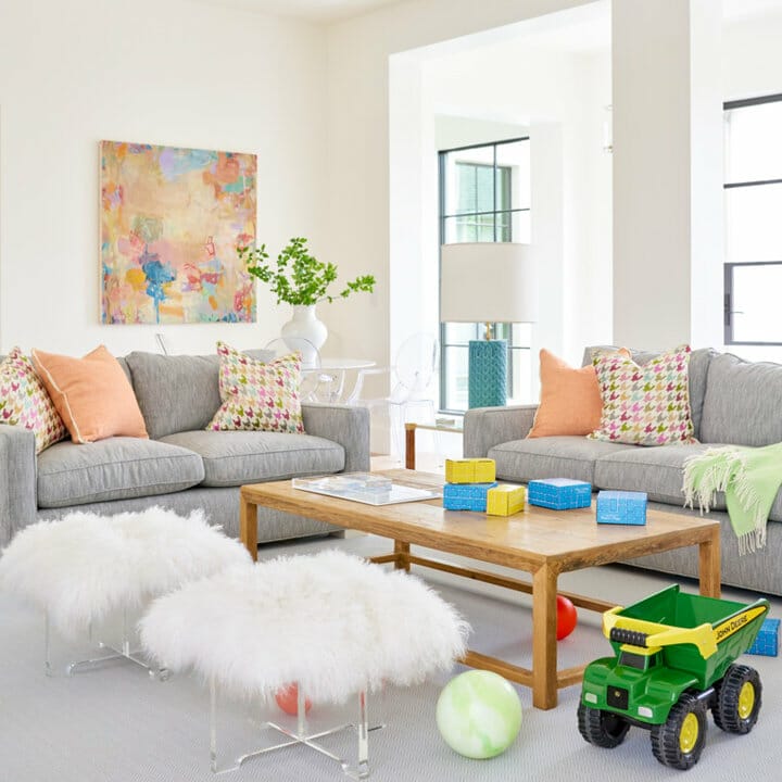 Gray couches become a subtle background for solid peach and multicolored pillows. Moreover, the pale gray rug sets the stage for fluffy stools and vibrant kids’ toys.