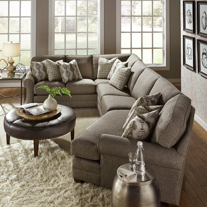 Although the sectional comes in subtle gray, it gives this seating area tremendous dimension. Moreover, it allows fluffy and printed accent pillows to be the focal point.