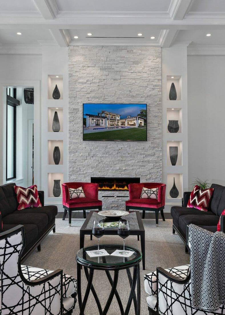 Homeowners also integrated a black couch, a long chair, and three accent chairs. They help produce a dramatic sitting area.