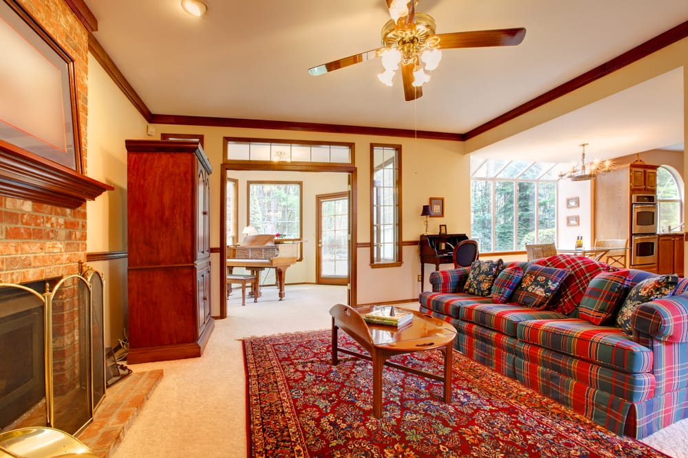 Plaid sofa, patterned rug, and floral throw pillows catch the eye. Meanwhile, brick fireplace brings outdoors indoor.