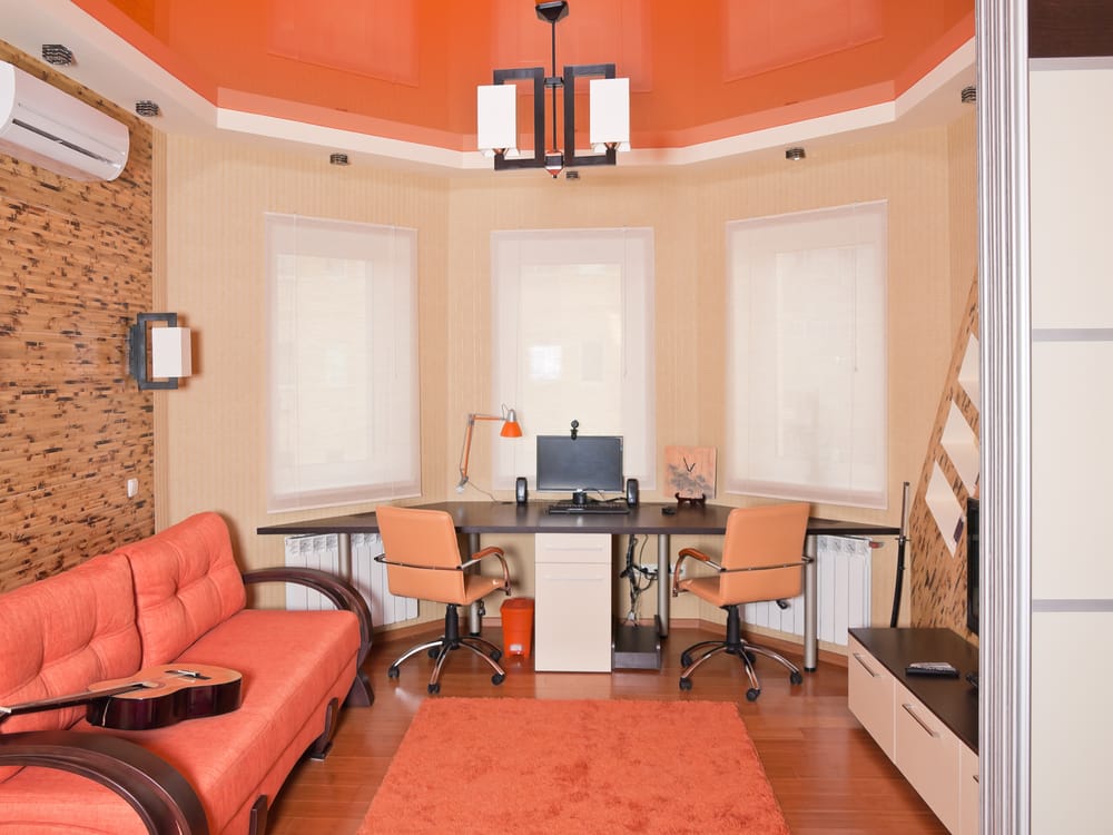 Peach tufted sofa, rug, guitar, ceiling, and rolling chairs make the entire room more lively and energetic. Wooden floor and accent walls add a touch of nature to the sitting area.
