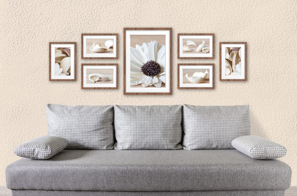 Grey sofa and throw pillows pair strikingly with the painted textured wall. Framed floral pictures elegantly fill the bare wall.