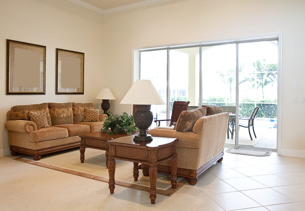 You can place tan brown sofas and wooden tables on the ochre floor. Put potted plant on the coffee table to jazz up the room.