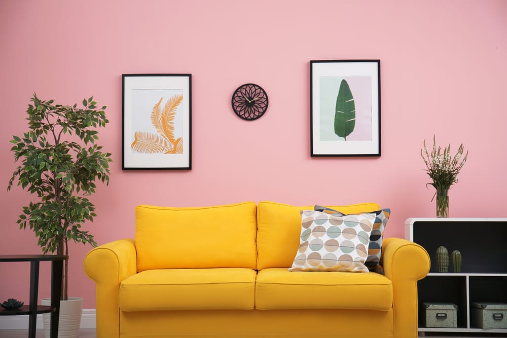 Pastel pink wall emanates a feminine feel. Meanwhile, butterscotch yellow sofa pops against it. The floor cabinet houses storage boxes and ornamental pieces.