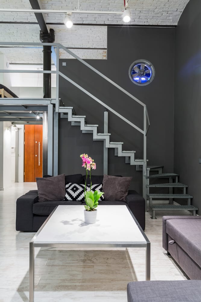 Metal coffee table, staircase, track task light, and exposed pipes lend the area an industrial appeal. Patterned throw pillow pops on black sofa. Lastly, pink flowers soften the look of masculine living room.
