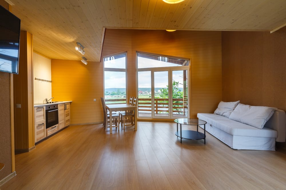 In this minimalist wooden cottage, there are a living room and integrated kitchen. White sofa and throw pillows contrast beautifully with black double-decker coffee table.