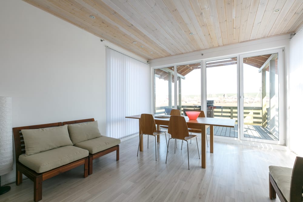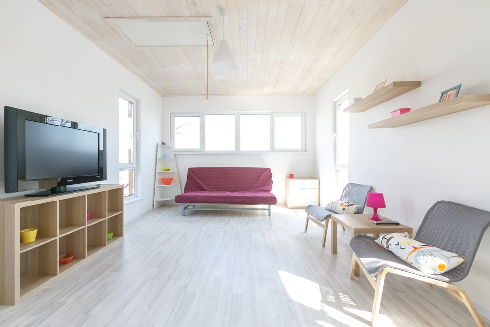 Here, I have a Scandinavian living room. The walls are painted using Benjamin Moore’s Chantilly Lace. They lead to crisp white living room walls. Glass windows develop a sunny and open atmosphere.