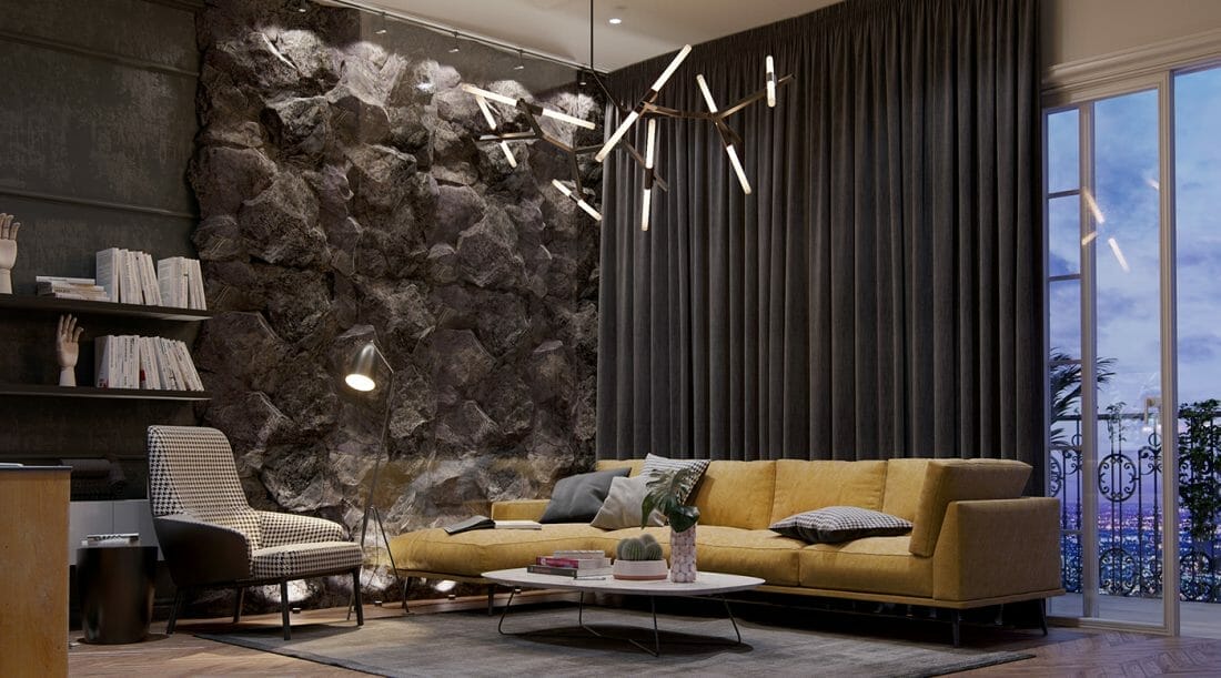 Floor-to-ceiling curtains wear dark gray. Also, they lend the bachelor pad sitting area a mature and sophisticated ambiance.