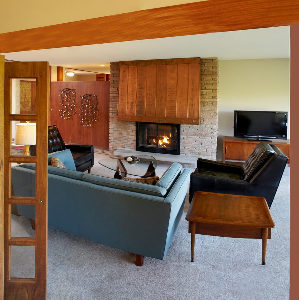 Also, the metal fireplace and black leather chairs carry a masculine feel. Different gray tones help balance this mid-century sitting area.