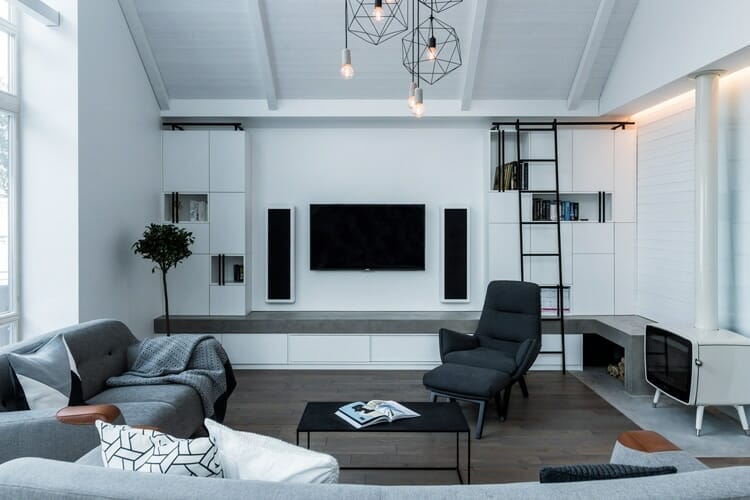 I admit this monochromatic man’s living room is superb. It belongs to a stilted house. Moreover, it boasts concrete surfaces under the TV that also house firewood.