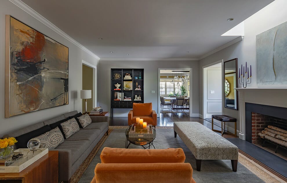 Deep-toned gray walls and tray ceilings add depth. Meanwhile, artworks and windows lighten up the sitting area.
