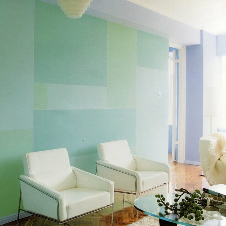 As you see, the color-blocked wall of this living room wears pastel tones. In addition to creating a statement, it jazzes up the simple interior.
