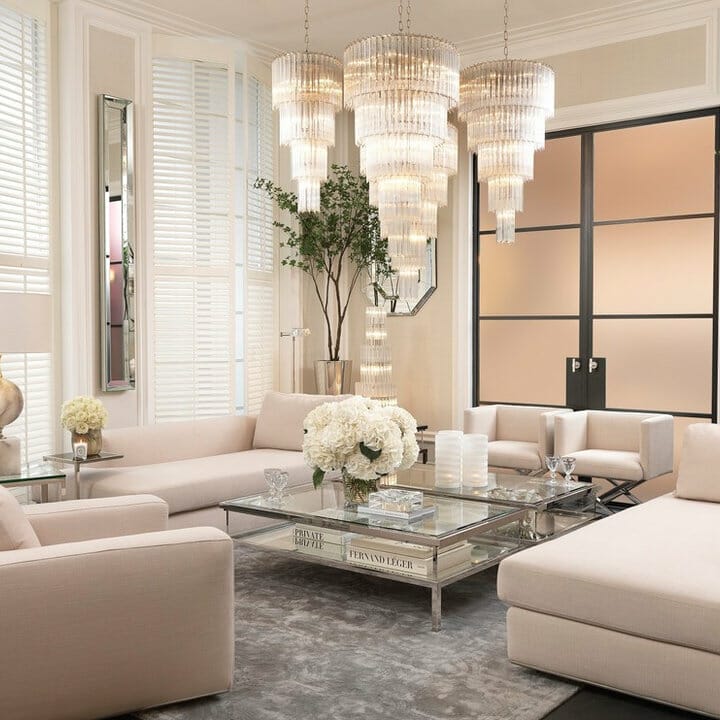 Silver accents send out a feeling of glamor, while cascade glass pendants exude a contemporary aesthetic. Lastly, the tall plant and soft white blooms enliven the living room with pastel neutrals.