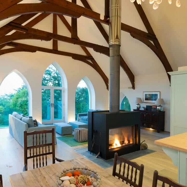 Vaulted ceiling beams and arched windows emit a traditional appeal. Furthermore, the warm wooden sideboard, framed artwork, and metallic table lamps create formal symmetry. In addition, the black fireplace generates visual depth while offering a toasty scene.