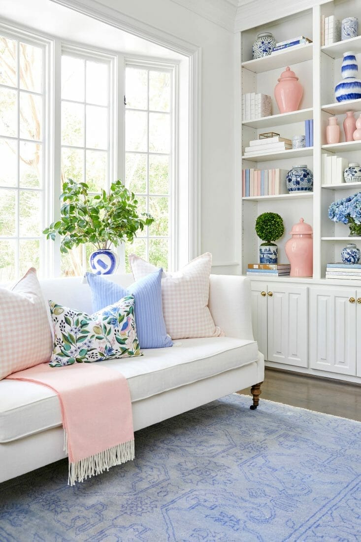 The pastel pink accessories give the living room touches of elegance and romance. Moreover, blue accents on the rug, pottery, pillows, and book covers balance their feminine appeal out. Additionally, houseplants and delicate flowers bring the interior to life.
