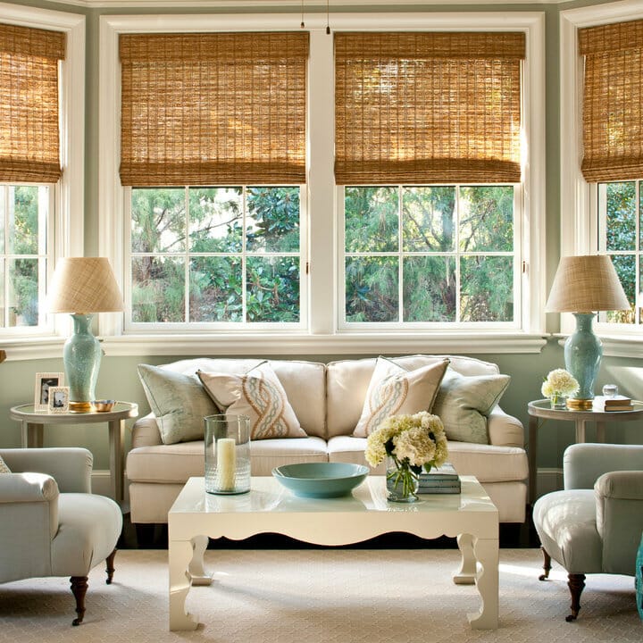 The pastel ivory sofa and gray chairs complement the sage wall. Furthermore, the blue bowl and table lamps inject this French country living room with a fresh look. Lastly, rattan blinds and jute lampshades lend the interior a coastal touch.