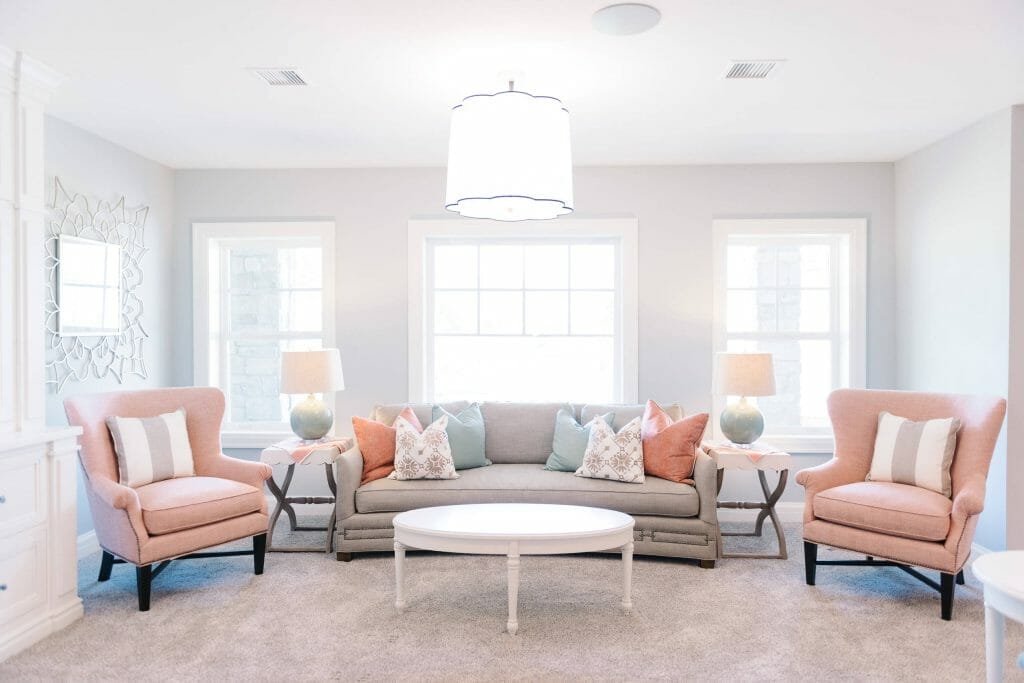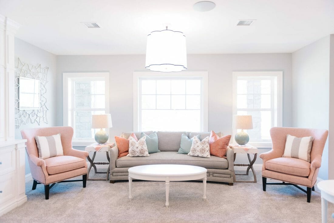 Because of pink wingback chairs, side tables, and pillows, this living room doesn’t seem basic. Furthermore, pastel blue accents keep the interior airy.