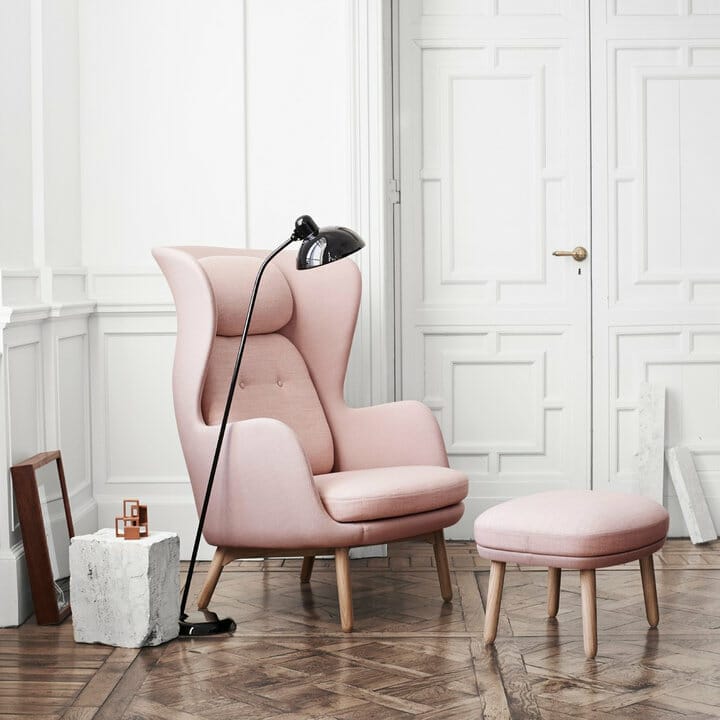 The white background emphasizes the pastel pink stool and wingback chair. Furthermore, the black floor lamp offers drama. Meanwhile, the square rugged stone and wooden elements provide natural vibes.