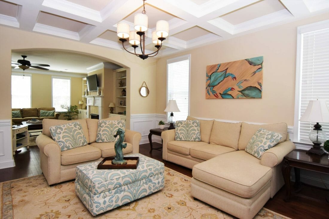 The soft white coffee table and cream beadboard ceiling planks soften the mood. Also, bright white trim details, windows, and sideboards maintain the living room’s airiness.