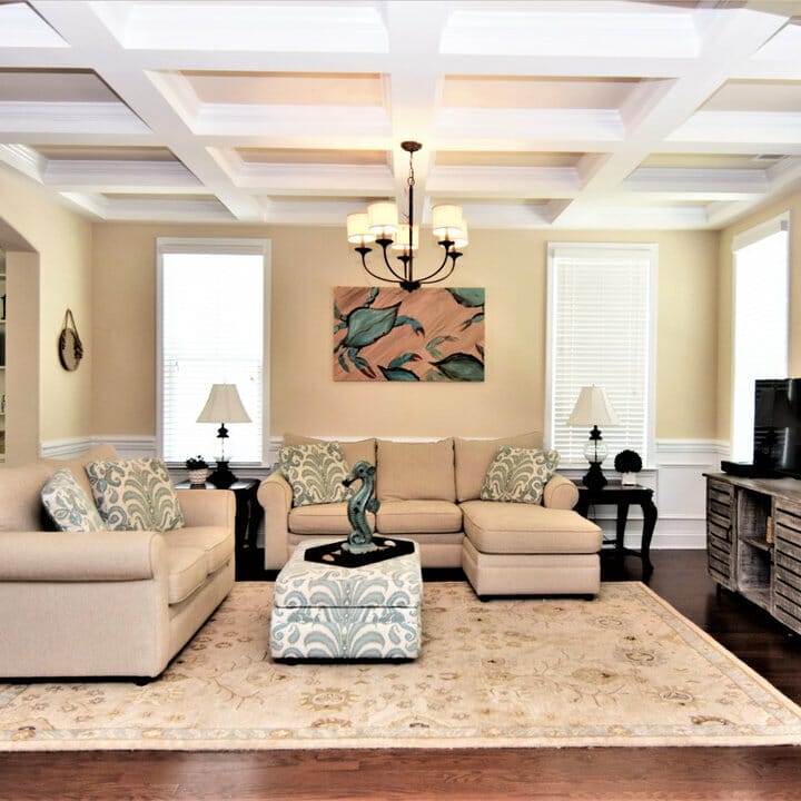 The coffered ceiling, rug, and light fixtures inspire grandeur. Meanwhile, the distressed white TV stand emanates a rustic charm.