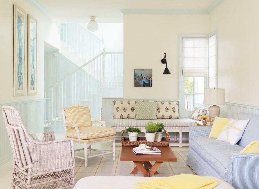 Here, the blanket, striped sofa, seat cushions, and pillows provide splashes of pastels. Lastly, neutrals balance them out.