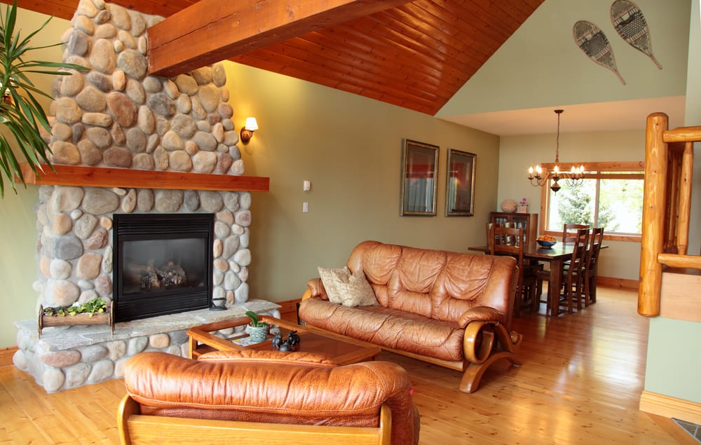 The wooden coffee table exhibits nature’s beauty. River rock fireplace adds visual interest to space.