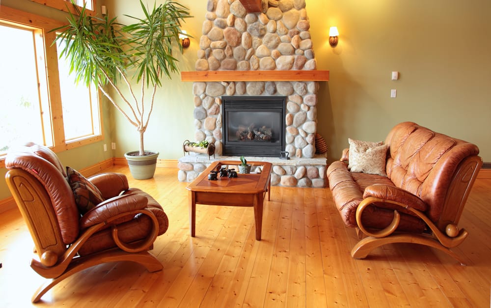 Wooden floor, river rock fireplace, and leather furniture lend the area rich textures. Tall potted houseplant fills a dead corner.