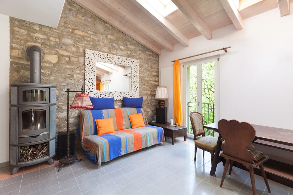 The rugged stone wall allows colorful couch cover and throw pillows to steal the attention. Meanwhile, white carved mirror decorates the room.