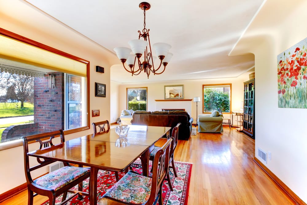 Wooden tables are rustic but in a more refined way. Antique chandelier and floor lamp light up the area. Floral rug, wall ornament, and dining chairs unify the zone.