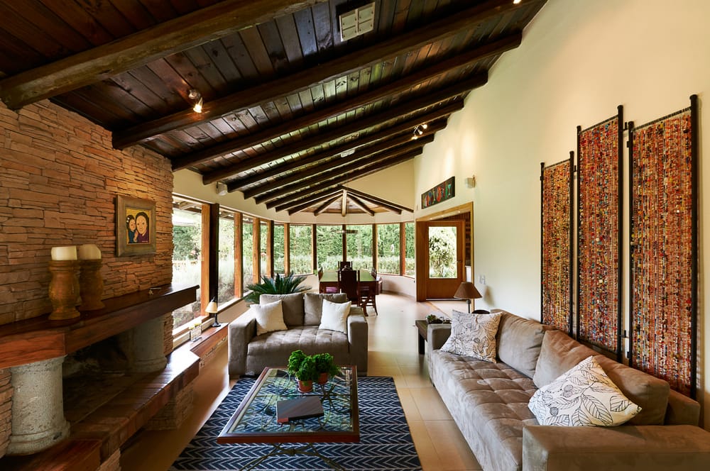 In the photo above, beige floor tiles and cream walls soothe the space. Stacked stone fireplace and wooden ceiling beams exhibit natural textures.