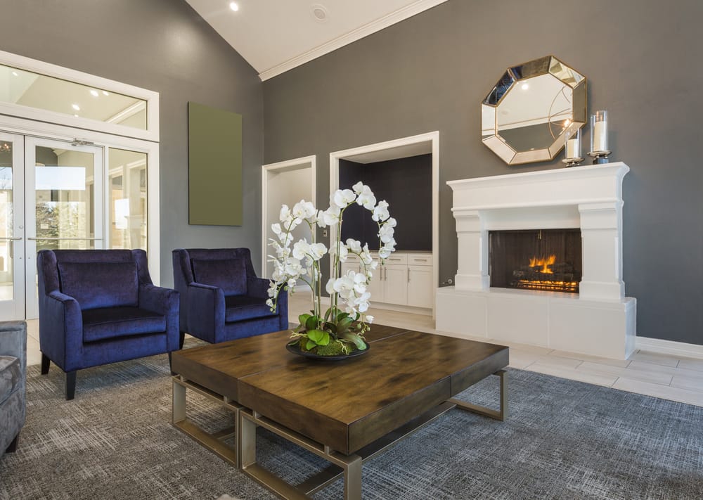 Dark blue velvet sofa chairs are the epitome of rustic opulence. White flowers spruce up the whole zone.