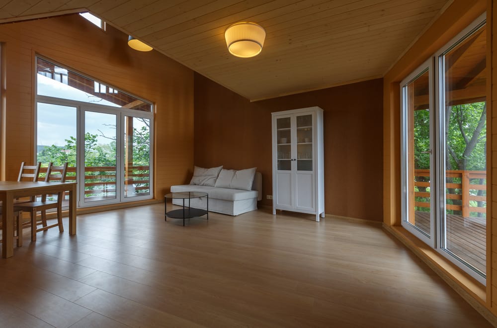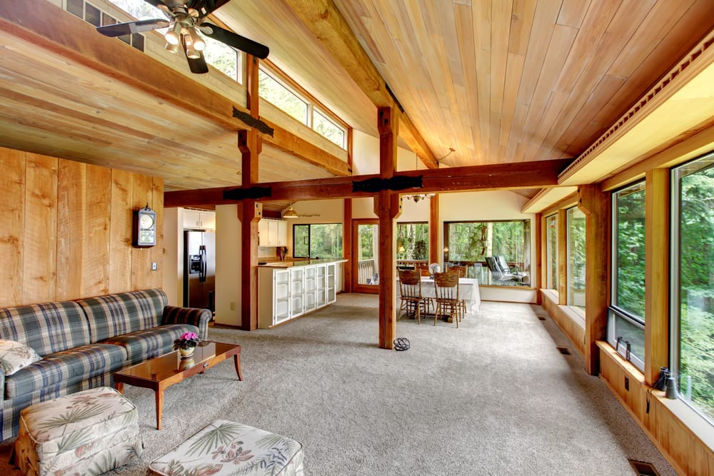 What’s not to love about this modern sitting room? It is clutter-free and trendy. Wood ceiling, floor, and walls convey tranquility.