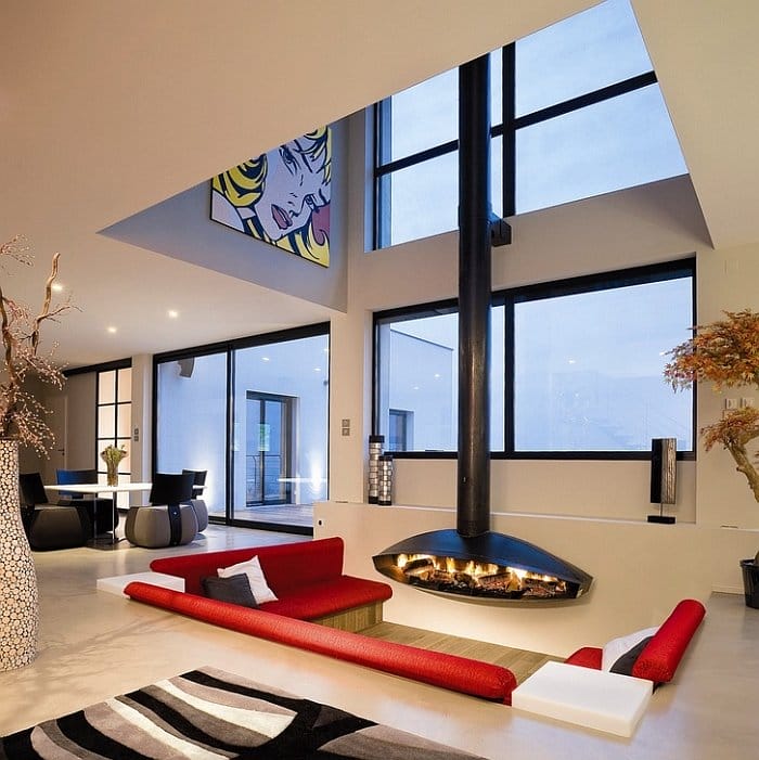 This tiny recessed living room looks welcoming, thanks to the wooden floor and loft-style fireplace. Red sofas stimulate conversation.