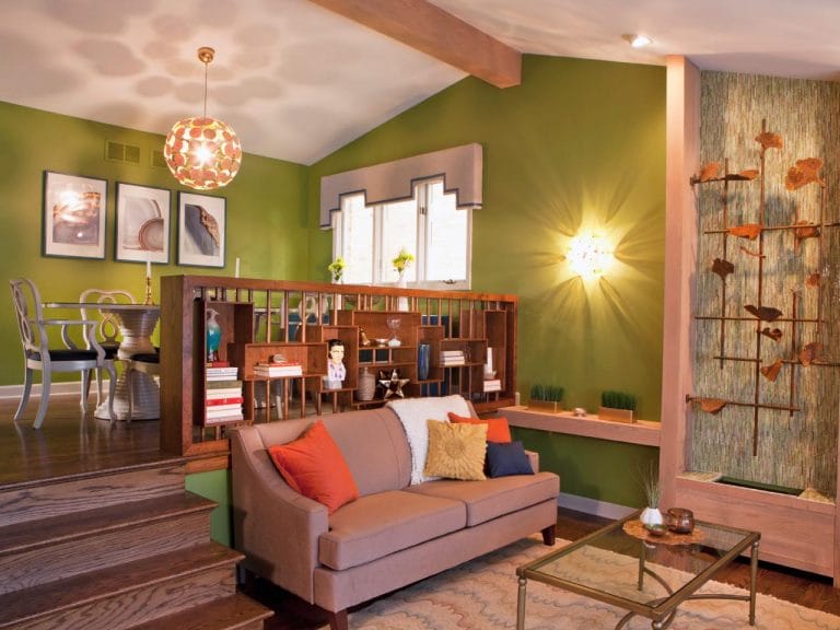 Furthermore, the pendant light matches the shape of cylinder coffee table. Bright green and striped throw pillows make the living room more appealing.