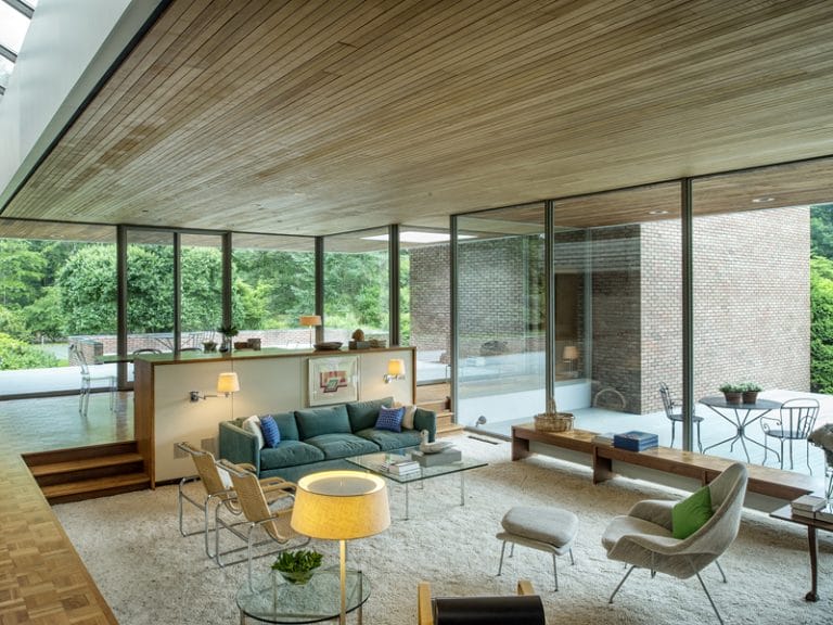 Furthermore, large windows and doors let in an abundance of daylight. The sofa and chairs in the 1970s recessed living room are facing each other. They spark up an intimate conversation.