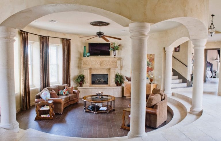 The intricate fireplace, pillars, and silk curtains promote a deluxe setting. Round coffee table, wooden floor, curved sofas, and wooden side tables inject an inviting vibe into the space.