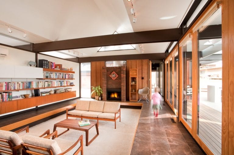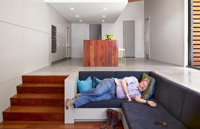 This sunken living space is not built in a high traffic area for convenience’s sake. The wooden steps give it warmth.