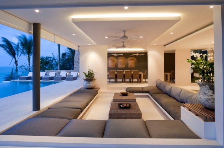 This step-down living room comes with discussion pits. The limestone tiles and wood table bring the elements of nature inside.