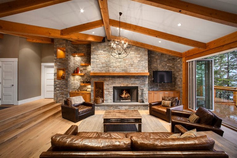 Here, bare wood floor, ceiling beams, and steps emanate a rustic vibe. Stacked stone wall and fireplaces give the living room more texture.