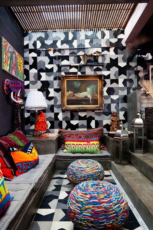 Colorful poufs and throw pillows keep the area from being monochromatic. The paintings, lanterns, table lamp, and statue carry a country feel to the interior. What a funky room!