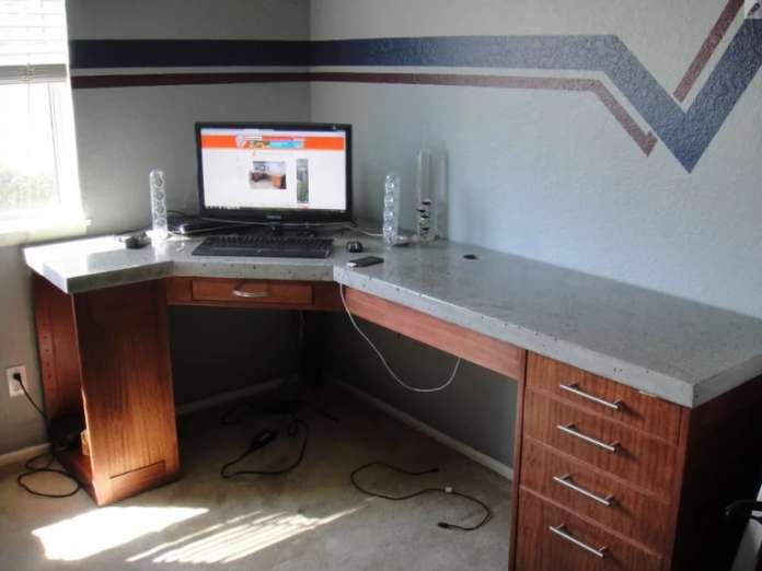 Add V-shaped computer desk to your home office. The polished concrete top surface is large enough to put the PC on. Moreover, the dark wood drawers under the table are perfect homes for office supplies, paper, and books.