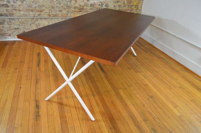 Above is a long computer desk with X-shaped legs. The dark-toned wood desktop and pure white legs introduce a lovely contrast. Furthermore, the desk is not just foldable, but also can accommodate two PCs and office utensils.