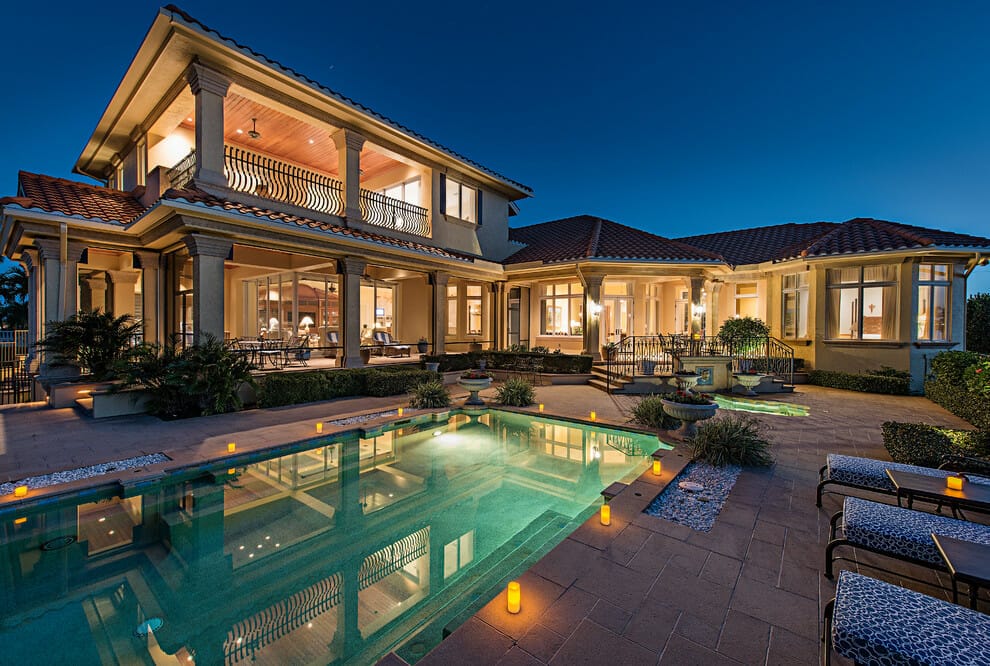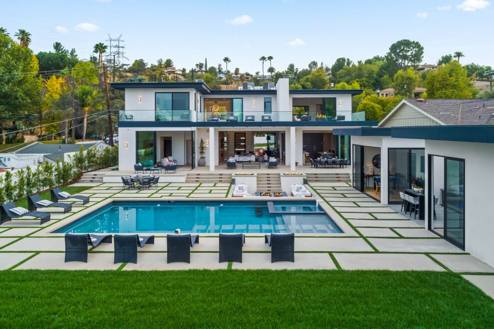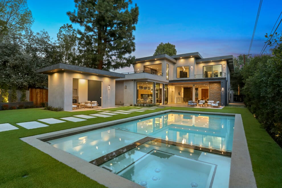 A manicured lawn surrounds the swimming pool nicely, creating a lavish green carpet that improves the curb appeal.