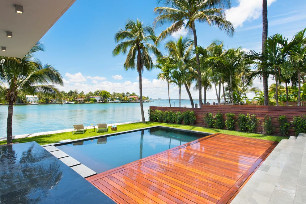 These rectangular pool landscaping ideas offer a breathtaking view. You can see the beautiful bay from here.