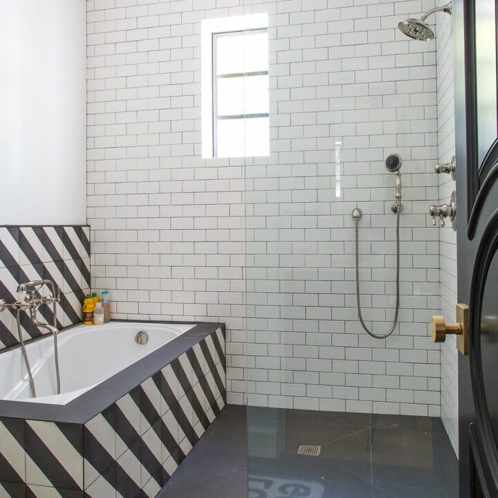 Here, the striped built-in bathtub and wall steal the show. Moreover, those statement items produce a graphic look in no time.