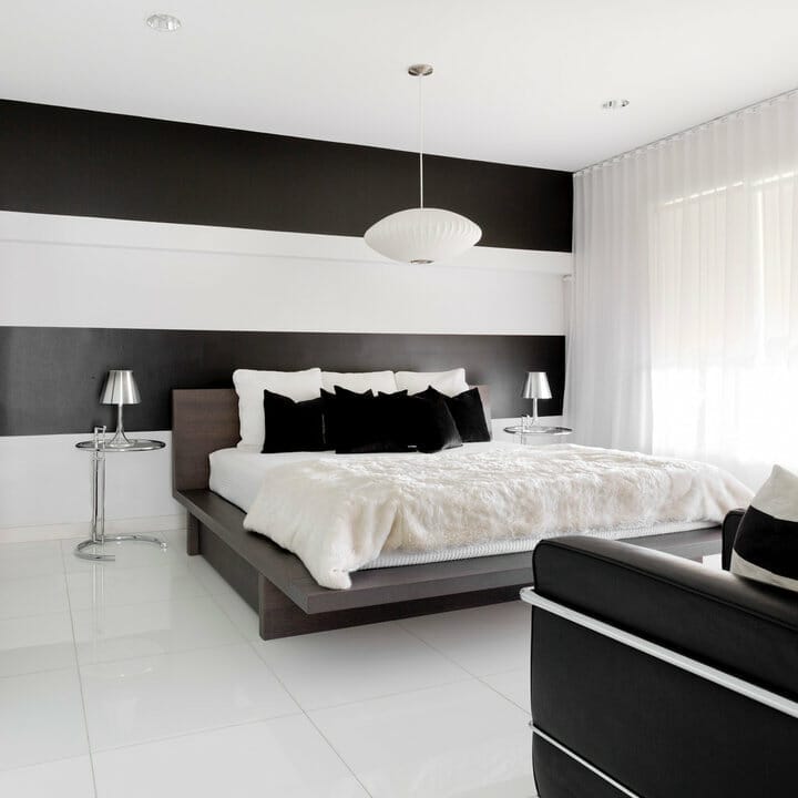 This contemporary bedroom has oversized white and black stripes. Not only do they carve an impression but also highlight the area’s width.